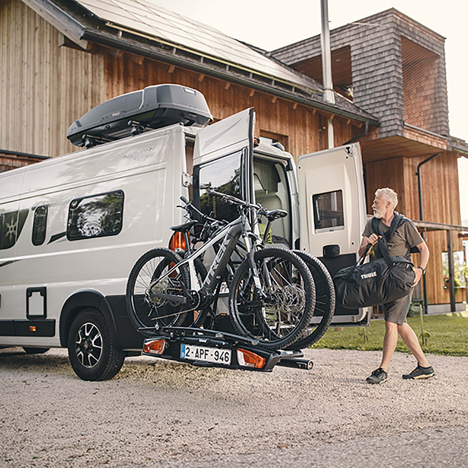 Lade deine E-Bikes auf und brich zu einem unvergesslichen Urlaub auf – mit der Thule Velo Swing, einer innovativen Anhängerkupplungslösung für den Transport von Fahrrädern an deinem Fiat Ducato, Citroën Jumper, Peugeot Boxer oder dem neuen Opel Movano Van.